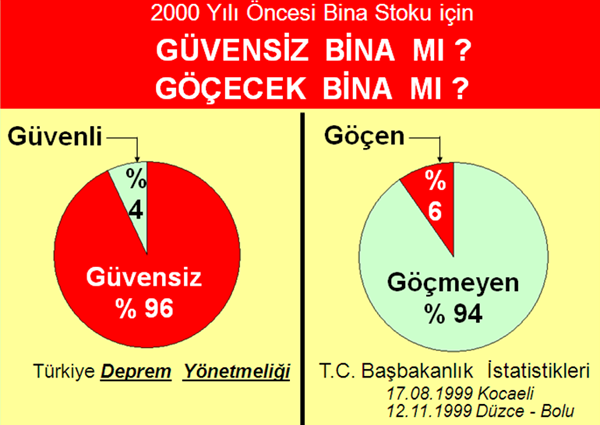 2001 yılından önce inşa edilmiş hangi binayı ele alırsanız alın, Türkiye  6 Mart 2007 tarihli Deprem Yönetmeliğinin amir hükümlerine göre ‘GÜVENSİZ ’ dir. Ancak, tüm bina stokunun % 4’ü kadar bir kısmı adı geçen yönetmeliğe göre ‘GÜVENLİ’ bulunabilir.