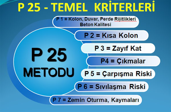| P25-hızlı değerlendirme programı; betonarme binaların şiddetli bir depremde “göçer mi, göçmez mi ?” durumunu bir saat gibi kısa bir süre içinde belirleyen analiz programıdır. Program; veri girişini statik ve mimari projeden 150’nin üzerinde veriyi alarak sağlar. Tahripkar olmayan yöntemler (ultrason) ile beton kalitesin belirlenmesi on dakika gibi kısa bir süre içinde tamamlanır. P25-hızlı değerlendirme yöntemi diğer hızlı değerlendirme yöntemleri arasında bir binanın “göçer mi, göçmez mi ?” durumunu en yüksek isabet derecesiyle gözler önüne seren, üzerinde Deprem Konusunda Uzman Kadroyla on yıldır çalışılan, devamlı gelişen dinamik bir yöntemdir. |
